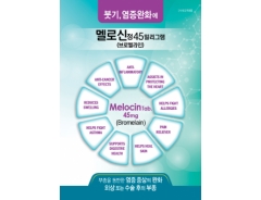 5월 말 멜로신정 45mg 출시됩니다. [ 제품 상세 ]? 제품명 멜로신정45밀리그램(브로멜라인)? 성분 브로멜라인 45mg? 성상 분홍색 장방형의 장용성 필름코팅정? 효능효과 부종을 동반한 염증 증상의 완화, 외상 또는 수술 후의 부종? 용법용량 성인 및 12세 이상의 소아 : 브로멜라인으로서 1회 45~90mg, 1일 3회 복용한다. 식사 30분 전에 물과 함께 복용한다. 체내에서의 작용기전의 아직 해명되지 않은 점이 많고 용량, 효과관계도 밝혀진 것이 아니므로 목적 없이 투여하지 않는다.? 저장방법 기밀용기, 25℃이하 보관? 포장단위 500 정/병,1000 정/병? 사용기간 제조일로부터 24 개월?