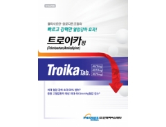 9월 초 트로이카정 40/5mg, 40/10mg, 80/5mg 출시됩니다. [ 제품 상세 ] 트로이카정 40/5mg 제품명 트로이카정40/5밀리그램? 성분 텔미사르탄 40mg 암로디핀베실산염 6.935mg? 성상 흰색과 연한 보라색의 양면이 볼록한 타원형 이중정? 효능효과 암로디핀 또는 텔미사르탄 단독요법으로 혈압이 적절하게 조절되지 않는 본태성 고혈압? 용법용량 이 약의 권장용량은 1일 1회 1정으로, 식사와 관계없이 물과 함께 복용한다. 가능하면 매일 같은 시간(예 : 아침)에 복용하는 것이 권장된다. 이 약을 투여하기 전에 개개의 성분(텔미사르탄 또는 암로디핀)으로 용량을 조절할 것이 권장되나, 다음과 같이 개개의 성분에 대한 혈압이 조절되지 않는 경우 이 약으로 바로 전환하는 것을 고려할 수 있다. - 40/5밀리그램 : 암로디핀 5밀리그램 또는 텔미사르탄 40밀리그램으로 혈압이 적절하게 조절되지 않는 환자에게 투여한다. - 80/5밀리그램 : 암로디핀 5밀리그램 또는 이 약 40/5밀리그램으로 혈압이 적절하게 조절되지 않는 환자에게 투여한다. - 40/10밀리그램 : 암로디핀 10밀리그램으로 혈압이 적절하게 조절되지 않는 환자에게 투여한다. - 80/10밀리그램 : 암로디핀 10밀리그램 또는 이 약 40/10밀리그램으로 혈압이 적절하게 조절되지 않는 환자에게 투여한다. 텔미사르탄과 암로디핀을 병용으로 복용하고 있는 환자인 경우, 복용의 편리함을 위하여 이 약(개개의 주성분 함량이 동일한 복합제)으로 전환할 수 있다 (이 약 40/5밀리그램, 80/10밀리그램에 한함). ○ 신장애 환자 : 경증 및 중등도 신장애 환자인 경우 용량조절이 필요치 않으나, 중증의 신장애 환자인 경우 낮은 용량으로 치료를 시작하는 것이 권장되며, 용량을 서서히 증량한다. 또한 혈청 칼륨 및 크레아티닌 수치에 대한 주기적인 모니터링이 권장된다. ○ 간장애 환자 : 경증 또는 중등증의 간장애 환자에 대한 텔미사르탄의 1일 투여량은 40밀리그램을 초과하지 않아야 한다. ○ 고령자 : 75세 이상의 고령자인 경우, 암로디핀의 청소율이 감소되어 있으므로, 낮은 용량으로 치료를 시작하며, 용량을 서서히 증량한다. ○ 소아 : 만 18세 이하의 소아환자에 대한 안전성ㆍ유효성이 확립되어 있지 않아 이 약의 투여가 권장되지 않는다.? 저장방법 차광기밀용기, 실온보관(1~30℃)? 포장단위 30정((10정/PTP)X3), 30정/병, 100정/병? 사용기간 제조일로부터 36개월 트로이카정 40/10mg 제품명 트로이카정40/10밀리그램? 성분 텔미사르탄 40mg 암로디핀베실산염 13.870mg 성상 흰색과 연한 보라색의 양면이 볼록한 타원형 이중정? 효능효과 암로디핀 또는 텔미사르탄 단독요법으로 혈압이 적절하게 조절되지 않는 본태성 고혈? 용법용량 이 약의 권장용량은 1일 1회 1정으로, 식사와 관계없이 물과 함께 복용한다. 가능하면 매일 같은 시간(예 : 아침)에 복용하는 것이 권장된다. 이 약을 투여하기 전에 개개의 성분(텔미사르탄 또는 암로디핀)으로 용량을 조절할 것이 권장되나, 다음과 같이 개개의 성분에 대한 혈압이 조절되지 않는 경우 이 약으로 바로 전환하는 것을 고려할 수 있다. - 40/5밀리그램 : 암로디핀 5밀리그램 또는 텔미사르탄 40밀리그램으로 혈압이 적절하게 조절되지 않는 환자에게 투여한다. - 80/5밀리그램 : 암로디핀 5밀리그램 또는 이 약 40/5밀리그램으로 혈압이 적절하게 조절되지 않는 환자에게 투여한다. - 40/10밀리그램 : 암로디핀 10밀리그램으로 혈압이 적절하게 조절되지 않는 환자에게 투여한다. - 80/10밀리그램 : 암로디핀 10밀리그램 또는 이 약 40/10밀리그램으로 혈압이 적절하게 조절되지 않는 환자에게 투여한다. 텔미사르탄과 암로디핀을 병용으로 복용하고 있는 환자인 경우, 복용의 편리함을 위하여 이 약(개개의 주성분 함량이 동일한 복합제)으로 전환할 수 있다 (이 약 40/5밀리그램, 80/10밀리그램에 한함). ○ 신장애 환자 : 경증 및 중등도 신장애 환자인 경우 용량조절이 필요치 않으나, 중증의 신장애 환자인 경우 낮은 용량으로 치료를 시작하는 것이 권장되며, 용량을 서서히 증량한다. 또한 혈청 칼륨 및 크레아티닌 수치에 대한 주기적인 모니터링이 권장된다. ○ 간장애 환자 : 경증 또는 중등증의 간장애 환자에 대한 텔미사르탄의 1일 투여량은 40밀리그램을 초과하지 않아야 한다. ○ 고령자 : 75세 이상의 고령자인 경우, 암로디핀의 청소율이 감소되어 있으므로, 낮은 용량으로 치료를 시작하며, 용량을 서서히 증량한다. ○ 소아 : 만 18세 이하의 소아환자에 대한 안전성ㆍ유효성이 확립되어 있지 않아 이 약의 투여가 권장되지 않는다. 저장방법 차광기밀용기, 실온보관(1~30℃)? 포장단위 30 정/상자(10정/피티피*3),30 정/병,100 정/병 사용기간 제조일로부터 36개월 트로이카정 80/5mg 제품명 트로이카정80/5밀리그램 성분 텔미사르탄 80mg 암로디핀베실산염 6.935mg 성상 흰색과 연한 보라색의 양면이 볼록한 타원형 이중정? 효능효과 암로디핀 또는 텔미사르탄 단독요법으로 혈압이 적절하게 조절되지 않는 본태성 고혈압? 용법용량 이 약의 권장용량은 1일 1회 1정으로, 식사와 관계없이 물과 함께 복용한다. 가능하면 매일 같은 시간(예 : 아침)에 복용하는 것이 권장된다. 이 약을 