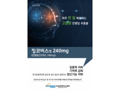 5월 말 징코비스정 240mg 출시됩니다.[ 제품상세 ] 징코비스정 240mg???? 제품명 ? 징코비스정 240mg? 성분 ? 은행엽 건조엑스 240mg? 성상 ? 녹색의 장방형 필름코팅정제 효능효과 ? 집중력 저하, 기억력 감퇴, 현기증(동맥 경화 증상)과 같은 증상이 동반되는 정신 기능 저하 용법용량 ? 성인 은행엽건조엑스로서 1회 240mg, 1일 1회 1정 복용한다. 식사와 관계없이 복용할 수 있다.? 저장방법 ? 기밀용기, 실온(1~30℃)보관? 포장단위 병포장) 30 정/병,500 정/병? 사용기간 제조일로부터 36 개월?